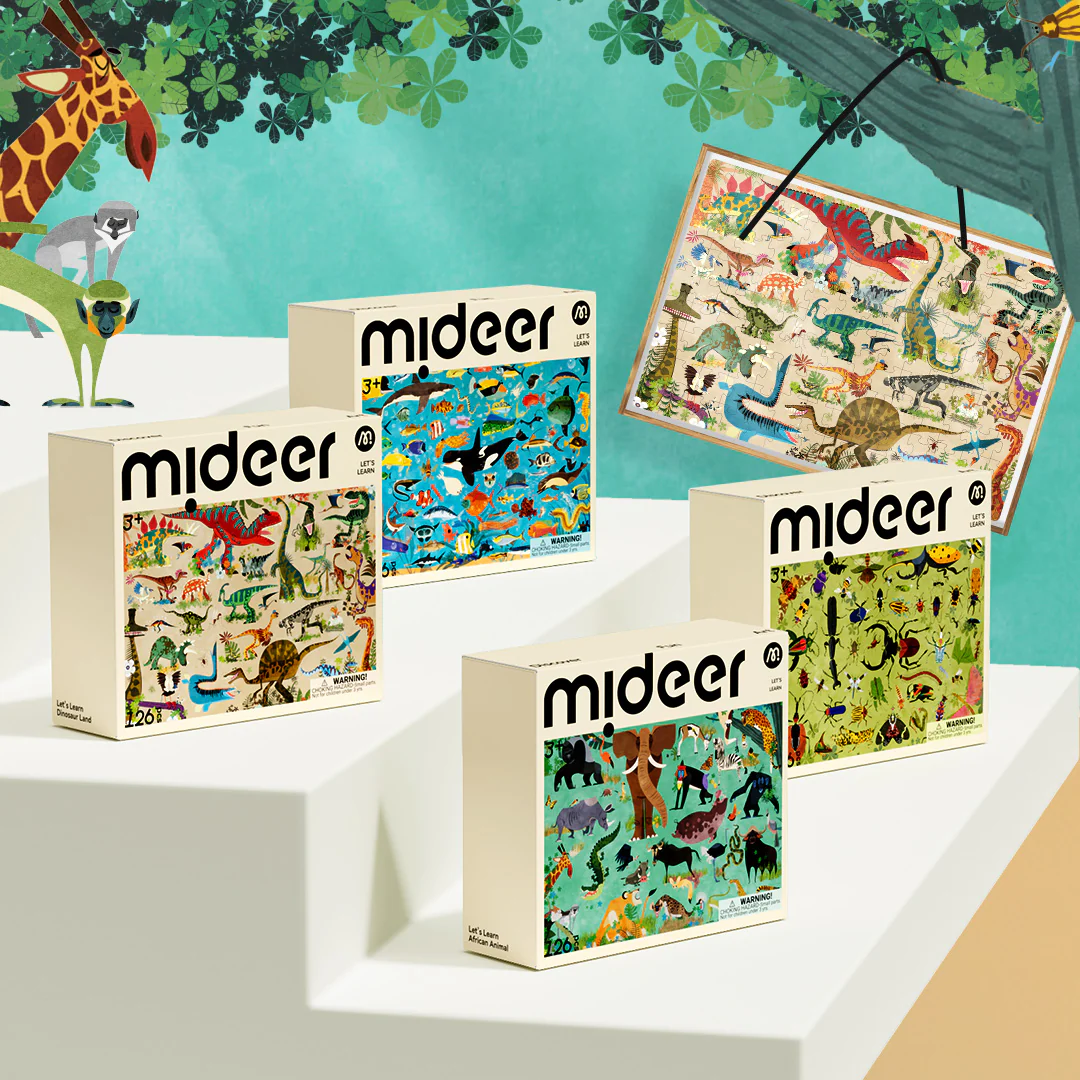 Sabana ardiente, sombras frescas y una manada de animales en plena acción. El puzzle ¡Aprendamos! – Animales de África de mideer lleva a los niños al corazón del continente, donde el elefante manda y el papión juega entre las hojas. Una ilustración educativa que despierta la curiosidad por la fauna y las maravillas de la naturaleza.
